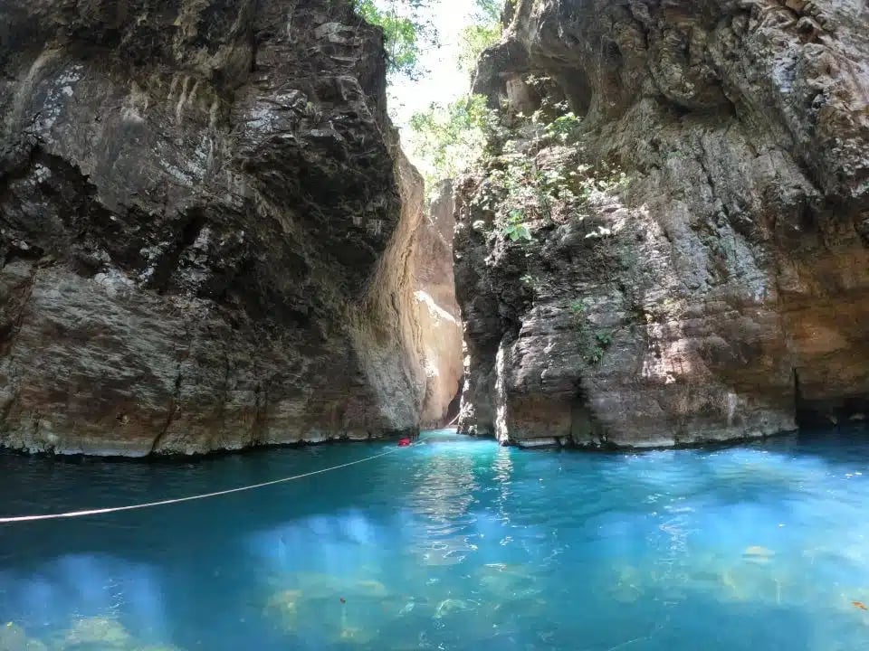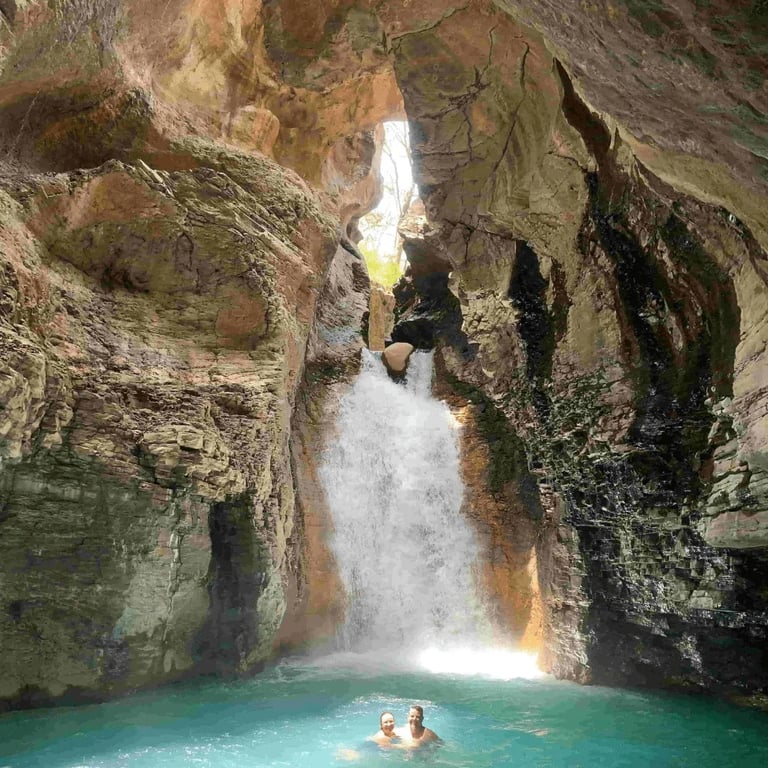 Tras el recorrido, el premio es impresionante: una caída de agua cristalina que se esconde entre enormes paredes de roca. La luz filtrándose entre los cañones, el color turquesa del agua y el sonido del agua cayendo hacen de este lugar un paraíso visual.