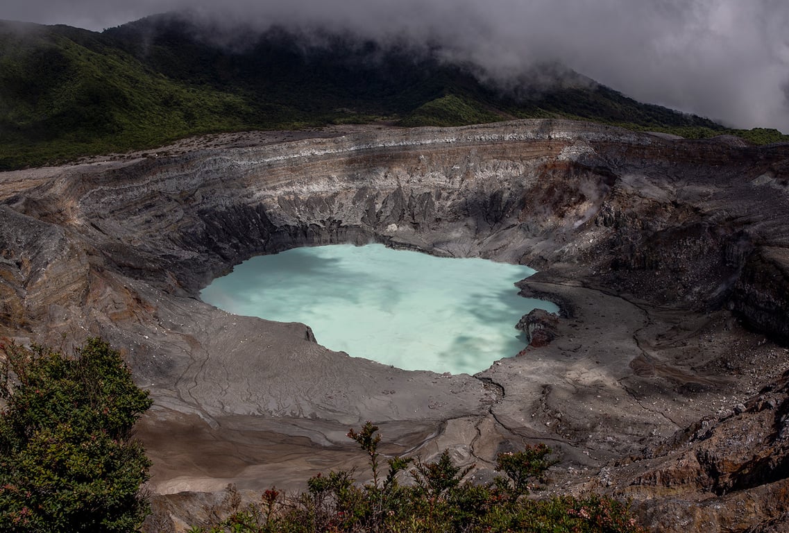 El cráter principal del Volcán Poás es uno de los más grandes del mundo, con aproximadamente 1.5 kilómetros de diámetro. Dentro de él, se forma una laguna ácida de un intenso color turquesa, que emite constantemente vapores y gases, ofreciendo un espectáculo visual único y surreal. El contraste entre la vegetación verde del bosque nuboso y el entorno árido del cráter genera una atmósfera que parece sacada de otro planeta.